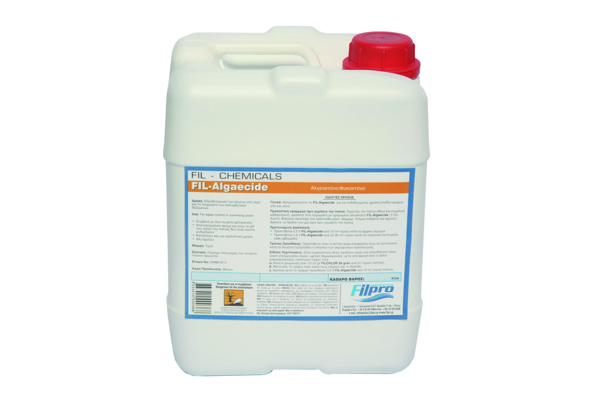 Το αλγοκτόνο Fil-Algeacide είναι ιδανικό για την πρόληψη της ανάπτυξης φυκών. Αποτρέπει τη δημιουργία άλγεων, δεν επηρεάζει το pH και καλύπτει πισίνες εως και 20.000 λίτρα. Κατάλληλο για προληπική χρήση, δεν περιέχει βαρέα μέταλλα και χλώριο.