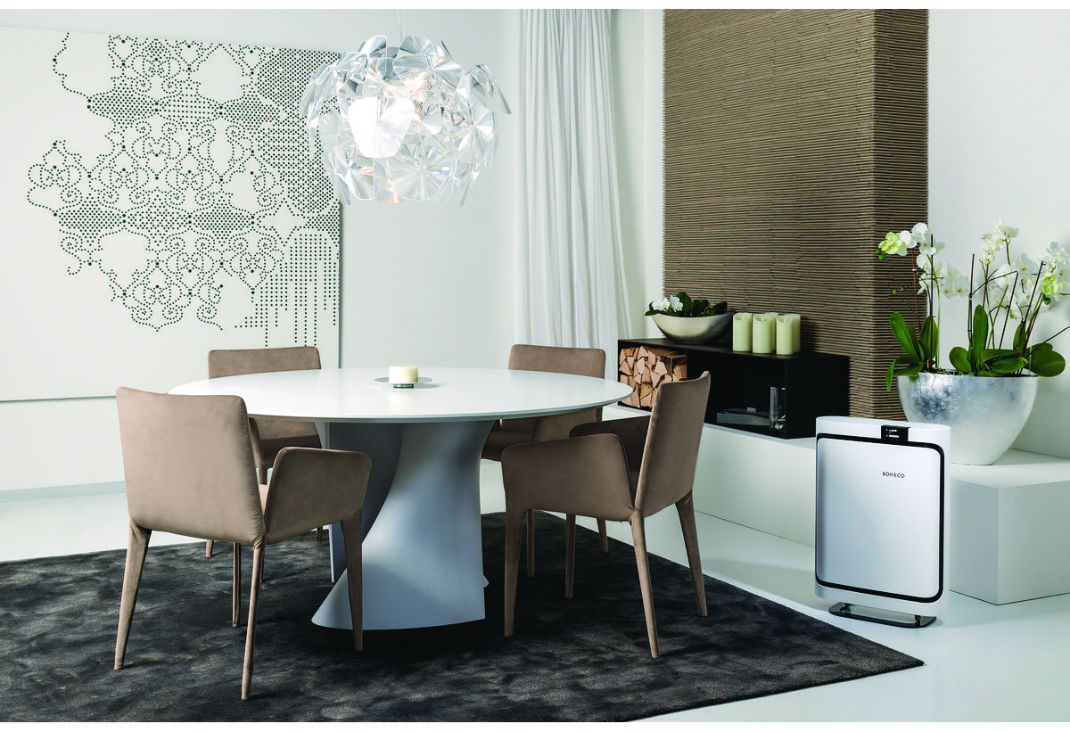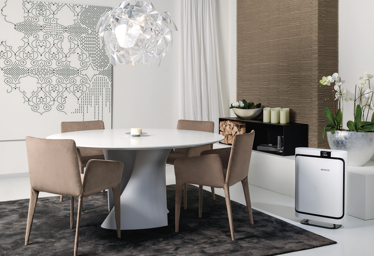Απεικονίζεται ο καθαριστής αέρα, τοποθετημένος σε μία τραπεζαρία