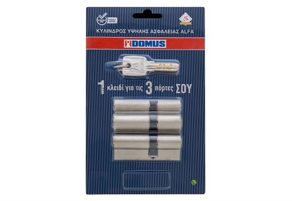 Σετ κυλίνδρων ασφαλείας Domus Alfa 65mm 30-45 σε φινίρισμα νίκελ που προσφέρει υψηλή αντοχή και ομαλή λειτουργία χάρη στο σώμα από ορείχαλκο και τις ενισχύσεις κατά θραύσης και διάτρησης, anti-snap και anti-drill. Οι τρεις κύλινδροι είναι key-alike πράγμα που σημαίνει ότι ανοίγουν με το ίδιο κλειδί ώστε να χειρίζεσαι τρεις πόρτες με ένα μόνο κλειδί, εξοικονομώντας χρόνο και αποφεύγοντας τα πολλά κλειδιά. Η λύση είναι ιδανική για κατοικίες με πολλές εισόδους ή για επαγγελματικούς χώρους όπου ζητείται απλότητα και οργάνωση. Σε περίπτωση απώλειας κλειδιού συνιστάται άμεση αντικατάσταση ή επαναρύθμιση όλων των σχετικών κυλίνδρων καθώς το ίδιο κλειδί λειτουργεί παντού. Το σετ περιλαμβάνει τρία τεμάχια με ευρωπαϊκό προφίλ και ταιριάζει στις περισσότερες πόρτες με διάσταση 75mm.