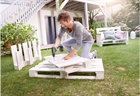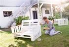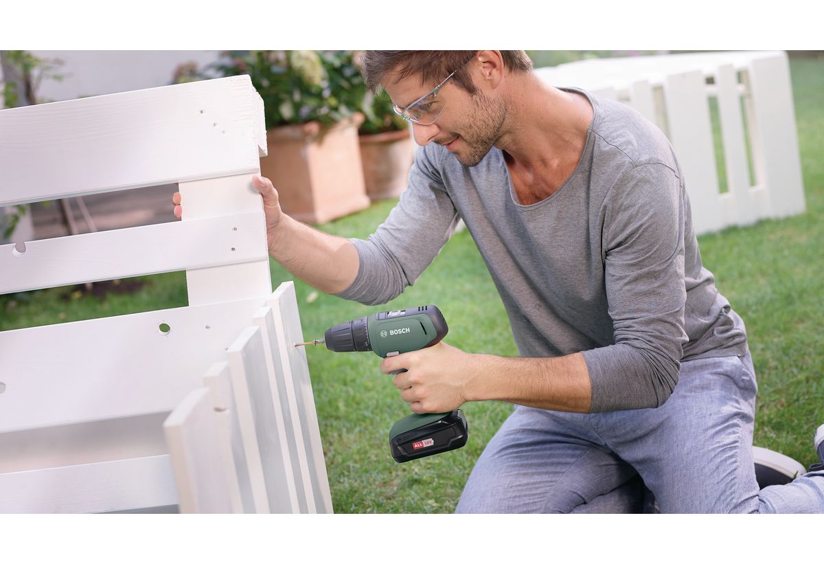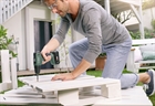 Απεικονίζεται ένας άνδρας να χρησιμοποιεί το δραπανοκατσάβιδο για την αρμολόγηση ενός παγκακιού.