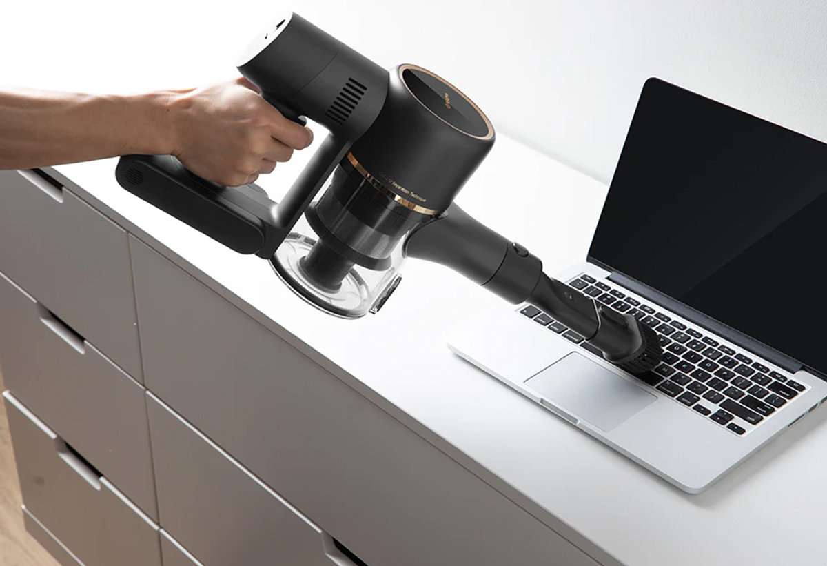 Απεικονίζεται η χρήση της σκούπας για τον καθαρισμό ενός λάπτοπ.