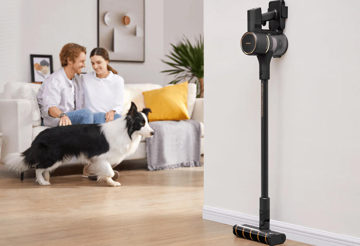 Απεικονίζεται η σκούπα στη βάση της στον τοίχο και δίπλα ένα ζευγάρι και ένας σκύλος στον καναπέ.