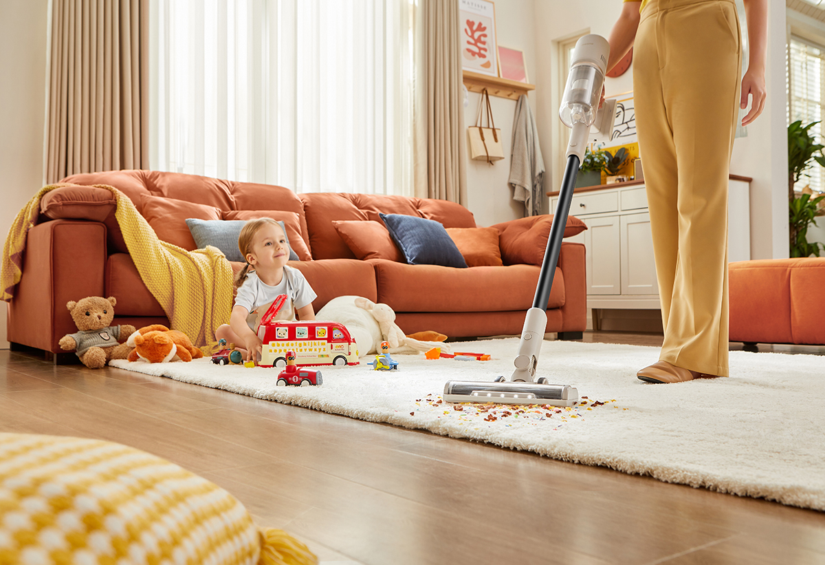 Απεικονίζεται μια γυναίκα να σκουπίζει το χαλί και δίπλα η κόρη της να παίζει με τα παιχνίδια της.