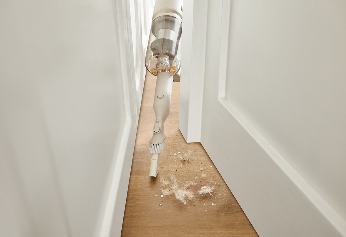 Απεικονίζεται το σκούπισμα σκόνης και τριχών σε στενό χώρο.