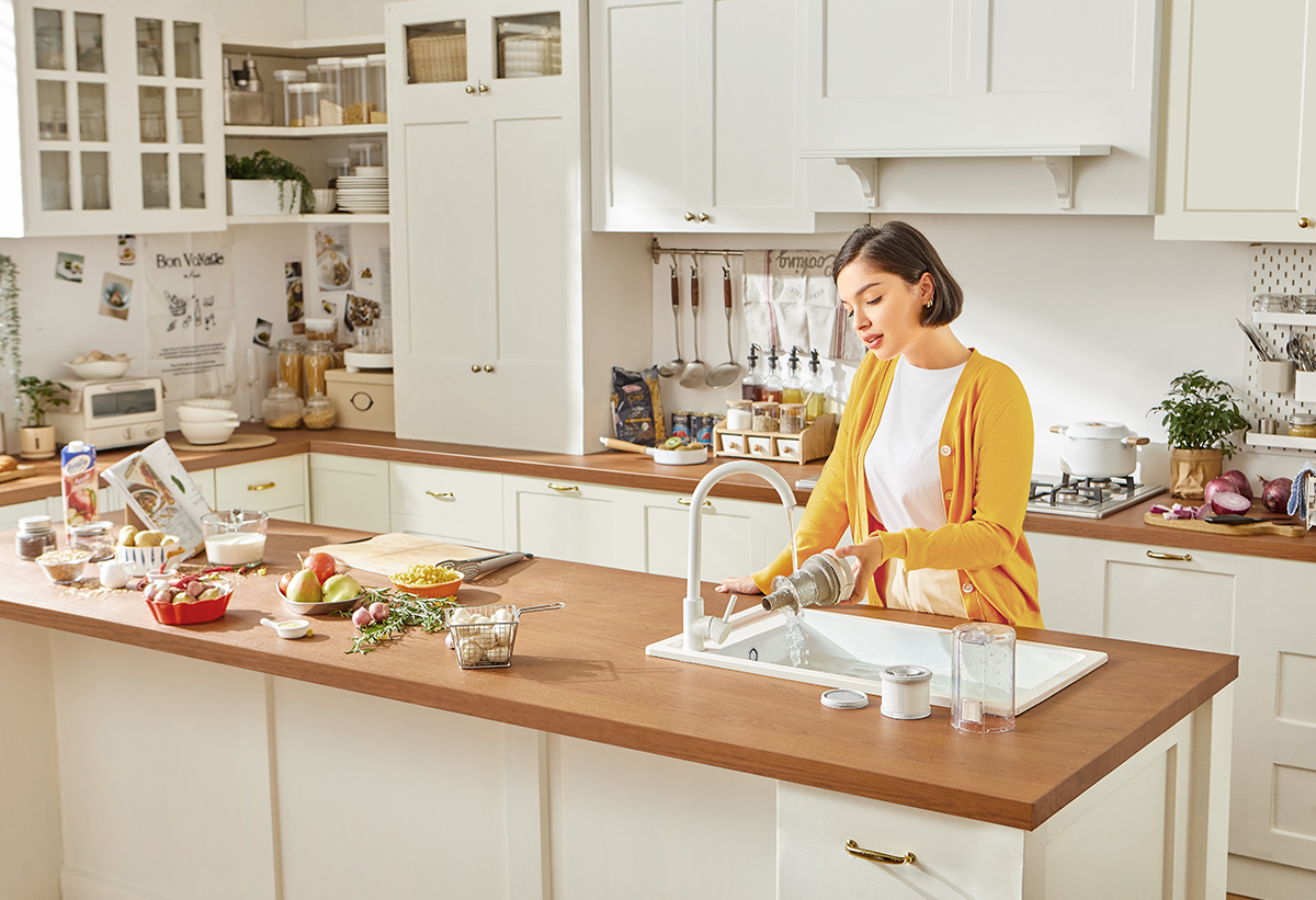 Απεικονίζεται μια γυναίκα να πλένει τα εξαρτήματα της σκούπας στον νεροχύτη.