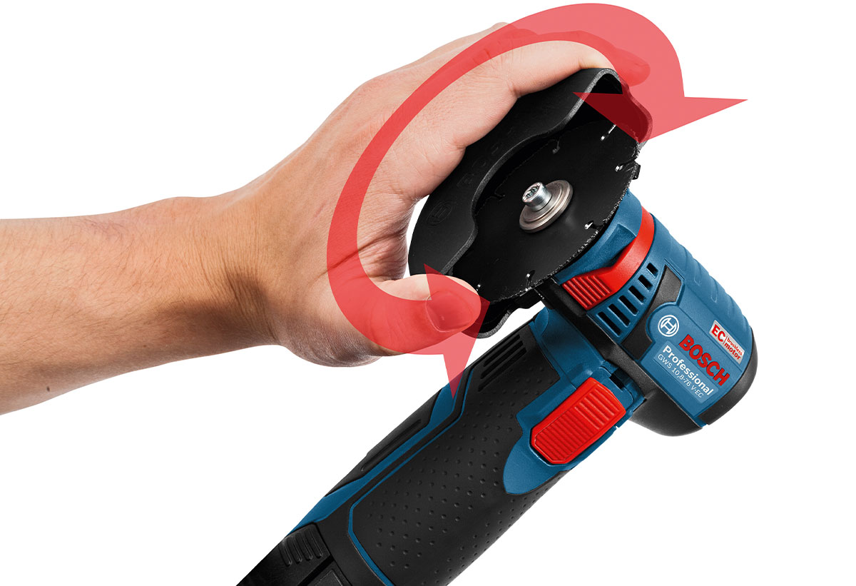 Ο γωνιακός τροχός μπαταρίας GWS 12V-76 Professional διαθέτει σύστημα Spindle Lock το οποίο μετατρέπει την αλλαγή των εξαρτημάτων στην πιο εύκολη και άνετη διαδικασία.