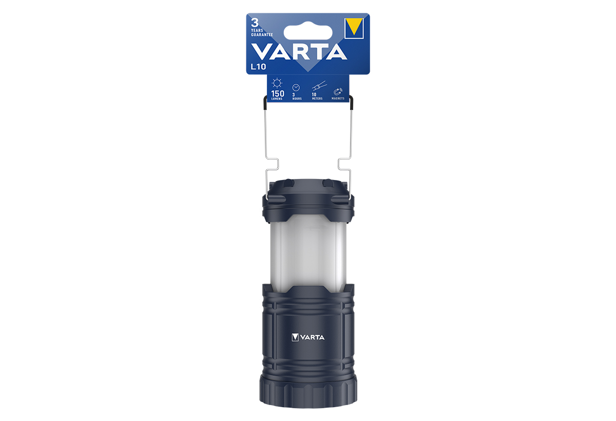 Φανάρι LED Varta L10, ιδανικό για διακοπές ρεύματος, κάμπινγκ ή τον πάγκο εργασίας. Ο ανασυρόμενος (pop-up) σχεδιασμός του προστατεύει το σώμα και τον διαχύτη όταν δεν χρησιμοποιείται, ενώ οι διπλές αναδιπλούμενες λαβές το κάνουν εύκολο στο κρέμασμα. Η μαγνητική βάση στερεώνεται με ασφάλεια σε μεταλλικές επιφάνειες, προσφέροντας φωτισμό hands-free όπου τον χρειάζεσαι.