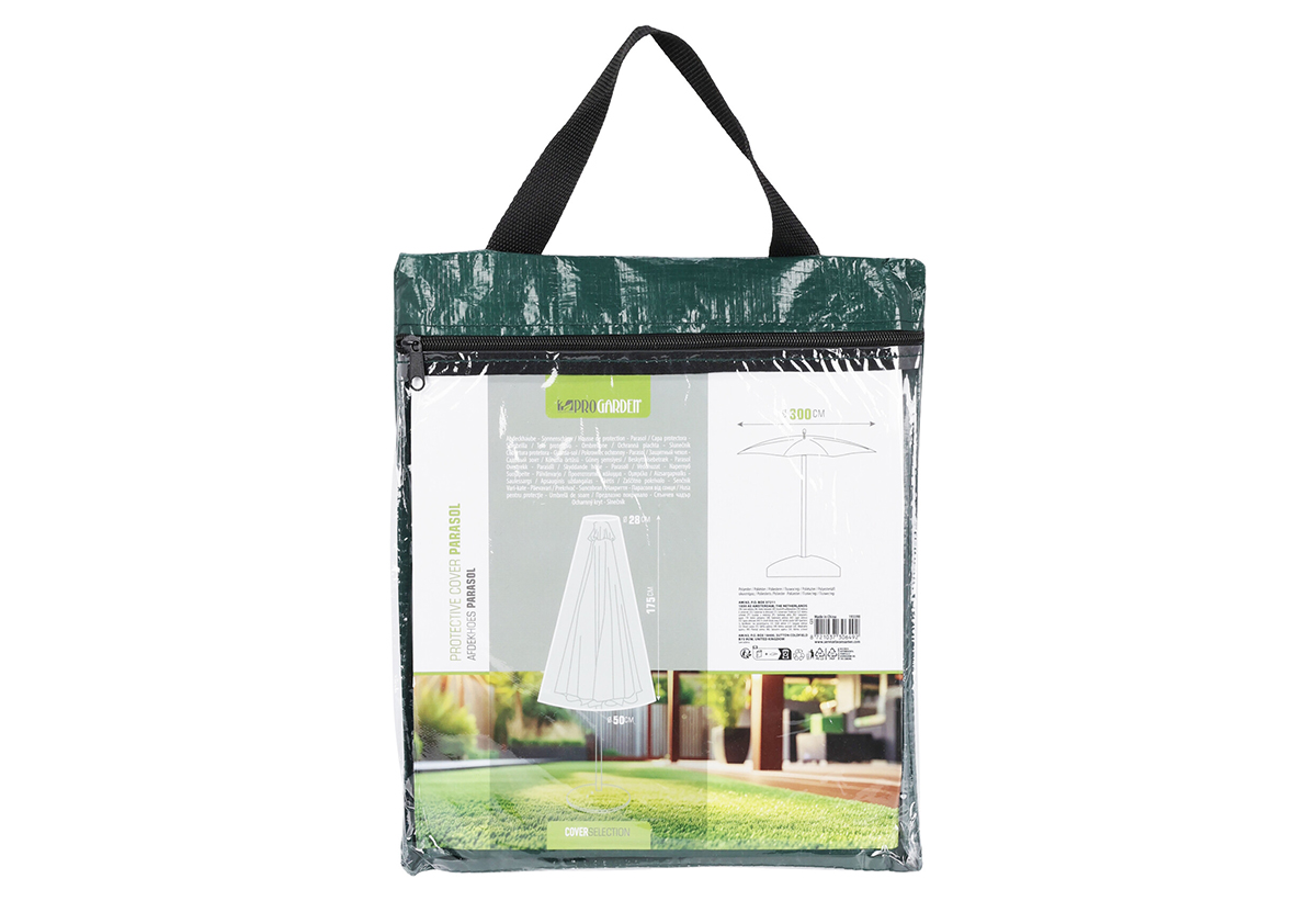 Προστάτευσε την ομπρέλα σου με το κάλυμμα διαστάσεων Φ300x175cm. Κατασκευασμένο απο πολυαιθυλένιο, προσφέρει αντοχή στο χρόνο αλλά και στη φθορά απο τις καιρικές συνθήκες, τη σκόνη αλλά και τις ακτίνες UV. Είναι εύκολο στη τοποθέτηση αλλά και στην αφαίρεση του και στο καθαρισμό και είναι η ιδανική λύση για κάθε εξωτερικό χώρο.