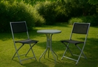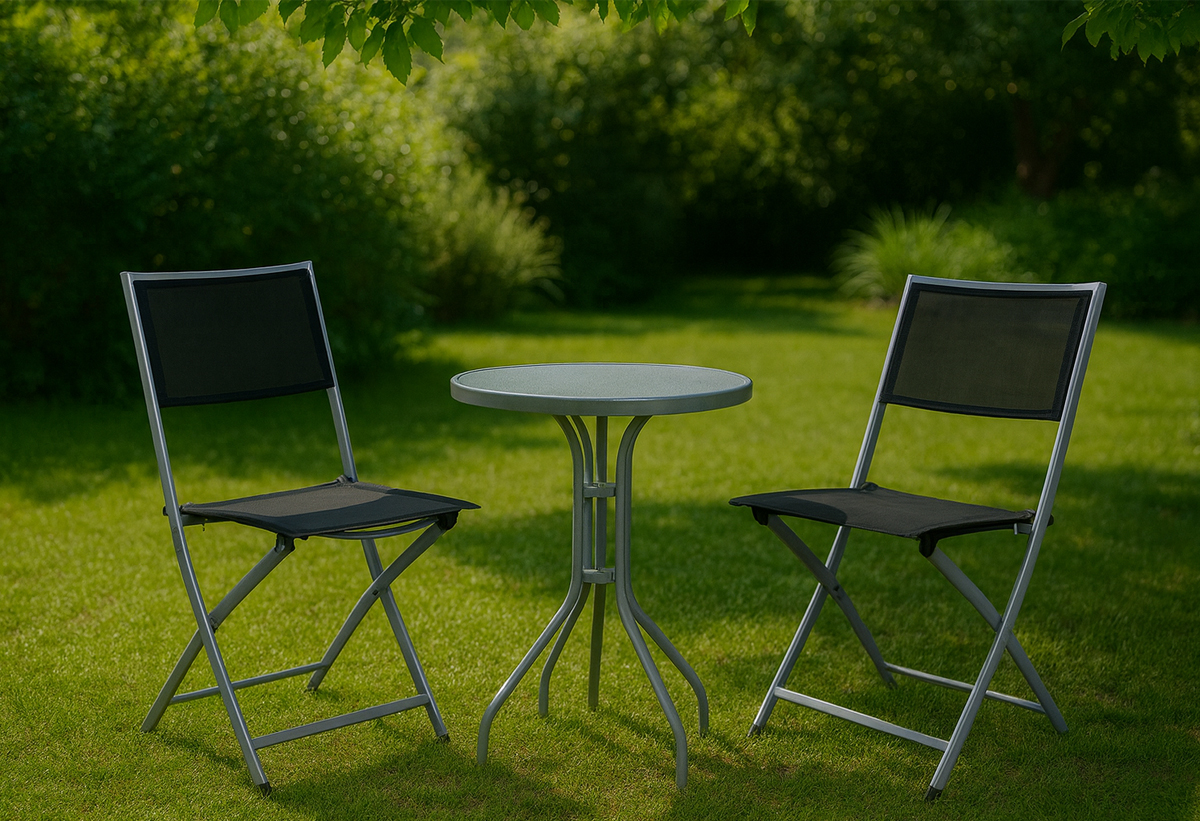 Απεικονίζονται δύο πολυθρόνες σε έναν κήπο, μαζί με ένα τραπέζι.