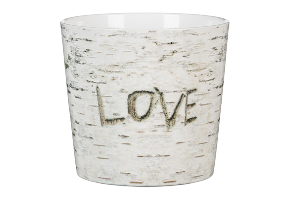 Κεραμικό κασπώ Scheurich Wood Betulla, με σχέδιο κορμός δέντρου με χαραγμένη την λέξη "LOVE", διαμέτρου: 15 cm.