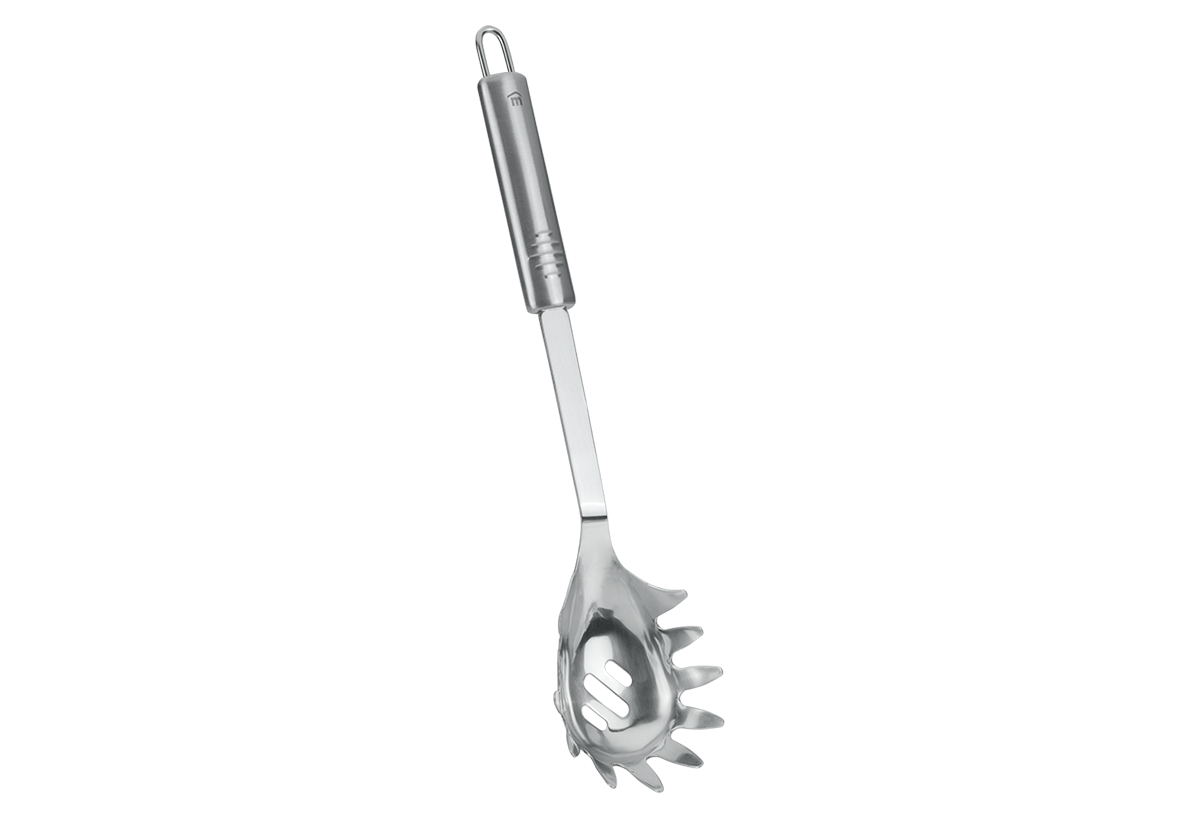 Κατασκευασμένη από ανθεκτικό ανοξείδωτο ατσάλι, προσφέρει μεγάλη διάρκεια ζωής και αντοχή στη συχνή χρήση, ενώ η εργονομική της λαβή εξασφαλίζει σταθερό και άνετο κράτημα. Τα ειδικά δοντάκια περιμετρικά συγκρατούν τα ζυμαρικά, ενώ το κεντρικό άνοιγμα επιτρέπει την αποστράγγιση του νερού πριν το σερβίρισμα.