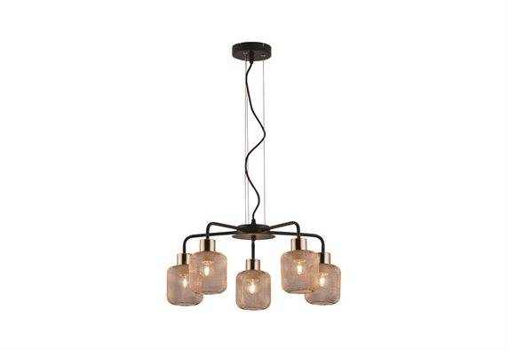 Το κρεμαστό φωτιστικό Loren διαθέτει 5 φωτεινά σώματα και μεταλλικό σκελετό σε κομψό συνδυασμό μαύρης και χρυσής απόχρωσης.