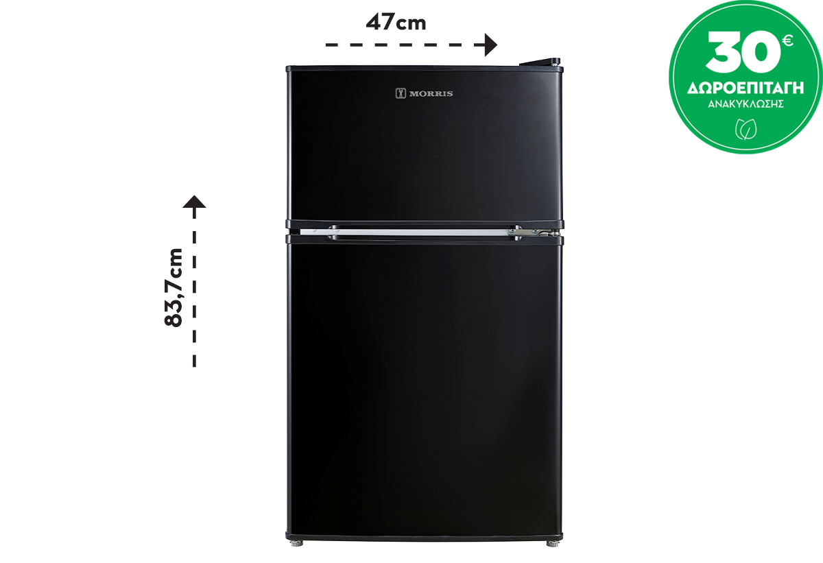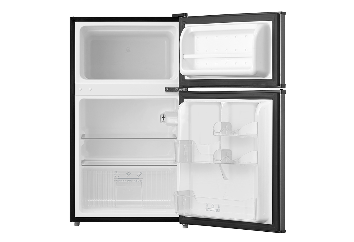 Ψυγείο δίπορτο με χωρητικότητα 87 λίτρα, που μπορεί να καλύψει άνετα τις ανάγκες ενός ατόμου ή ενός ζευγαριού. Διαθέτει 2 ράφια στον χώρο συντήρησης από γυαλί ασφαλείας και χώρο αποθήκευσης μπουκαλιών στην πόρτα.