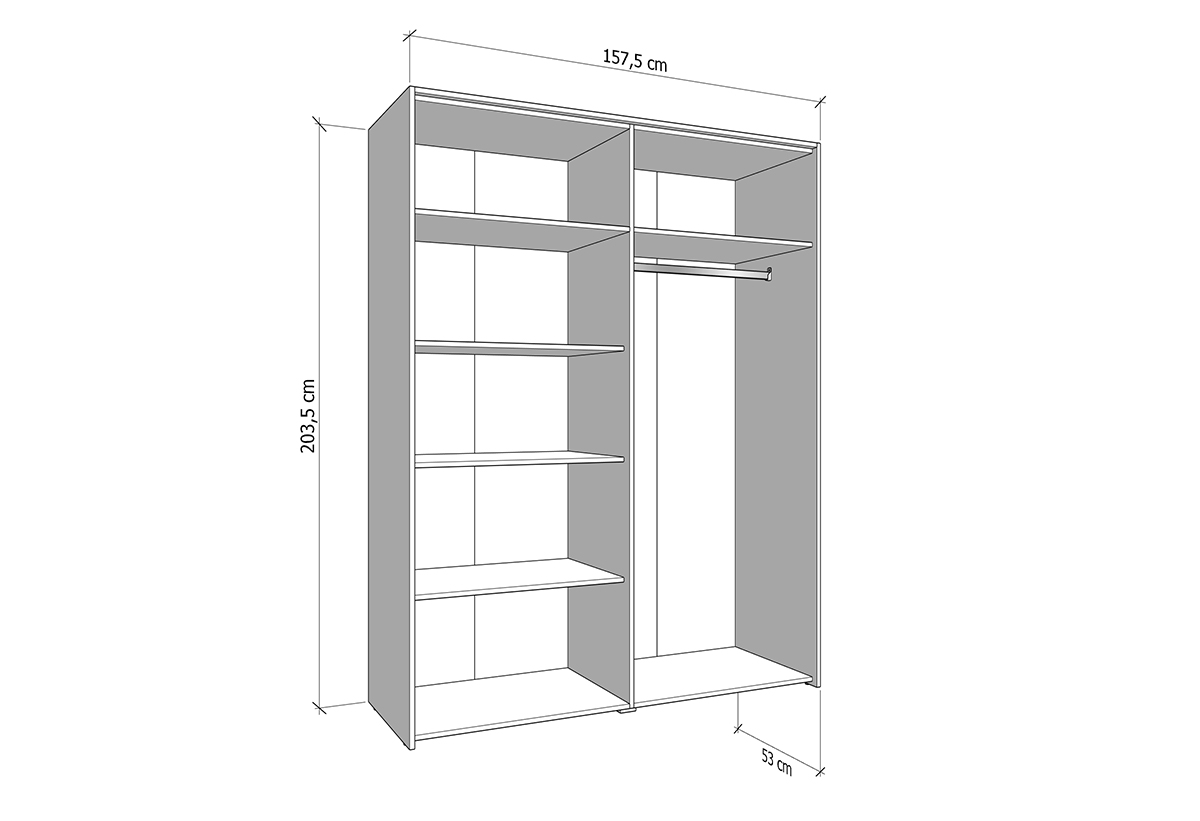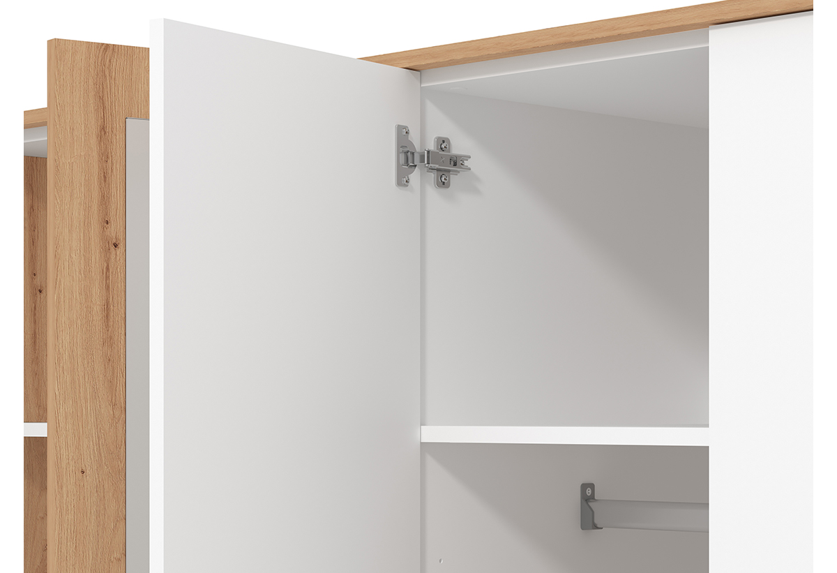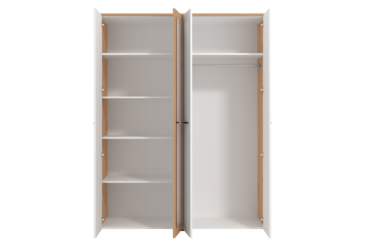 Το εσωτερικό της ντουλάπας έχει διαμορφωθεί με γνώμονα την πρακτικότητα. Διαθέτει άπλετο χώρο για να κρεμάς τα ρούχα σου, προστατεύοντάς τα από τσαλακώματα και συμπληρώνεται από 5 ευρύχωρα ράφια για διπλωμένα ρούχα. Οι πόρτες ανοίγουν πλήρως ώστε να έχεις εύκολη πρόσβαση, είτε θες να διαλέξεις ένα ρούχο, είτε να τακτοποιήσεις γρήγορα τα πάντα στη θέση τους.