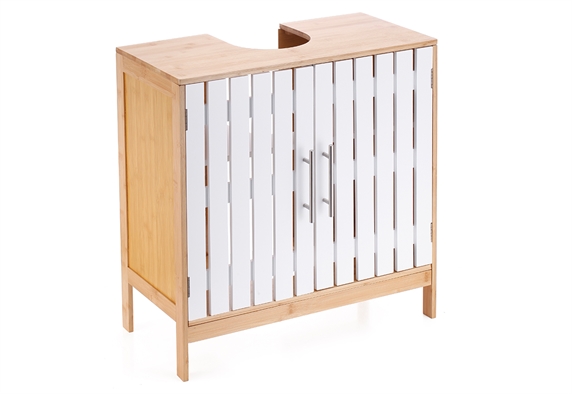 Αναβάθμισε το design του μπάνιου σου με αυτό το ντουλάπι. Προσφέρεται ως εξαιρετική προσθήκη για τον χώρο σου, η οποία συνδυάζει τη λειτουργικότητα και την αισθητική, χαρίζοντας μια πολυτελή νότα. Χάρη στην ανθεκτική του κατασκευή, παρουσιάζει αντοχή στον χρόνο, τη χρήση και την υγρασία. Αποθήκευσε τα διάφορα απαραίτητα αντικείμενα με ευκολία, εξοικονομώντας χώρο. Τέλος, η σύνθεσή του από μπαμπού, καθώς και η απόχρωσή του, η οποία συνδυάζει άρτια το λευκό με το καφέ, προσφέρει μια κομψή πινελιά. Είναι κατασκευασμένο για να τοποθετείται κάτω από τον νιπτήρα για μέγιστη εξοικονόμηση χώρου.