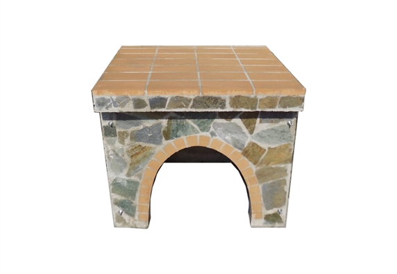 Πρόκειται για έναν χτιστό πάγκο ψησίματος με πυρότουβλο, κατάλληλο για χρήση σε κήπο ή αυλή. Η κατασκευή του από πυρότουβλα και επένδυση από πέτρα Καρύστου προσφέρει μεγάλη αντοχή στις υψηλές θερμοκρασίες και στις εξωτερικές συνθήκες, ενώ η επάνω επιφάνεια χρησιμοποιείται για την τοποθέτηση της σχάρας και των κάρβουνων. Το μπροστινό άνοιγμα σε σχήμα καμάρας επιτρέπει τον σωστό αερισμό της φωτιάς και διευκολύνει την πρόσβαση στον χώρο ψησίματος. Με διαστάσεις 90x76cm αποτελεί μια πρακτική και ανθεκτική λύση για παραδοσιακό ψήσιμο σε εξωτερικούς χώρους.