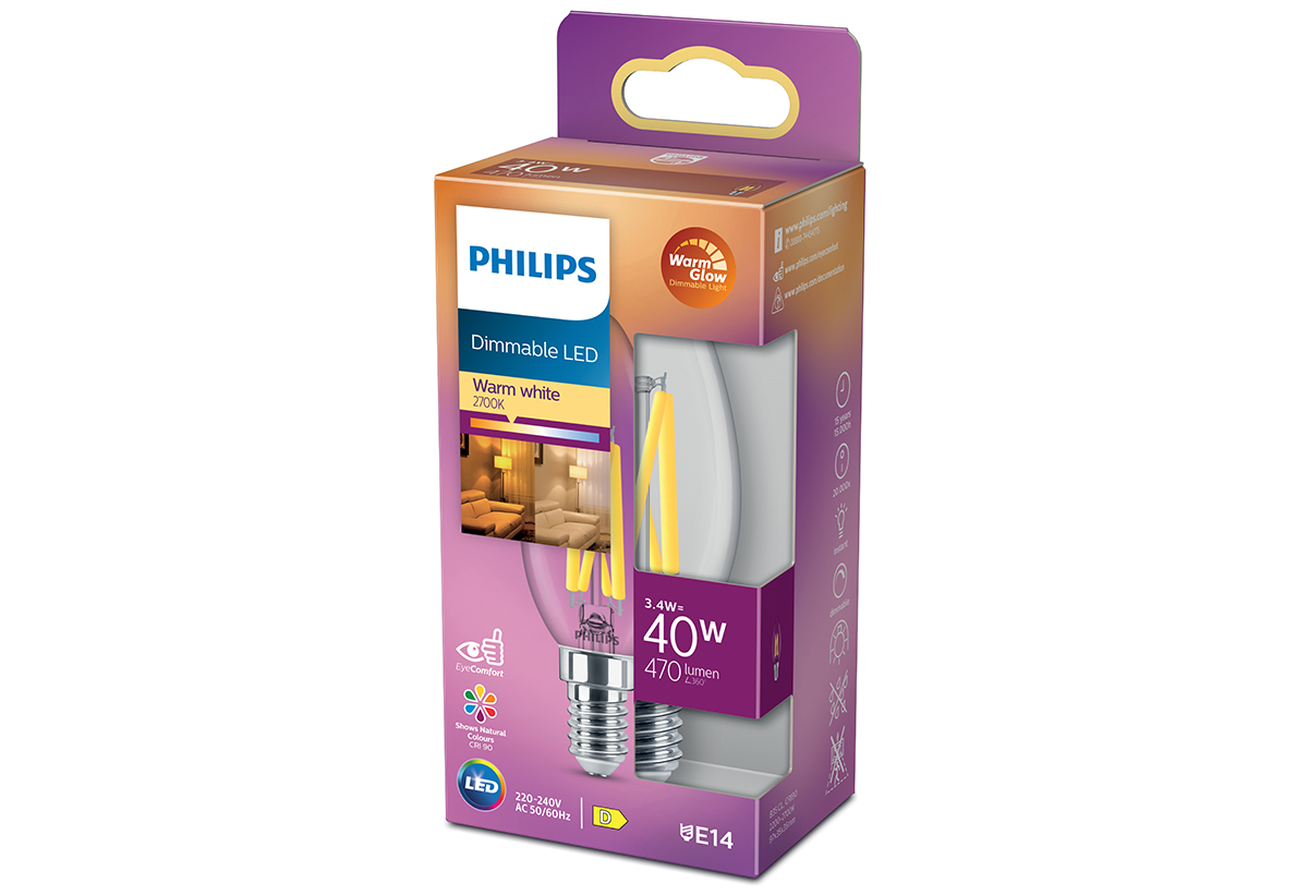 Philips Λαμπτήρας LED E14 Dimmable 3.4-40W 470lm με σχήμα Β35 Warm Glow