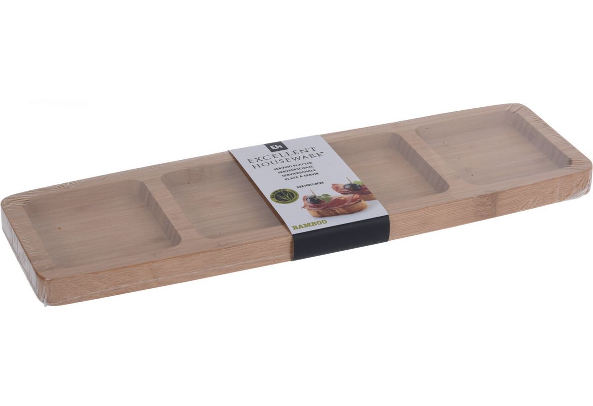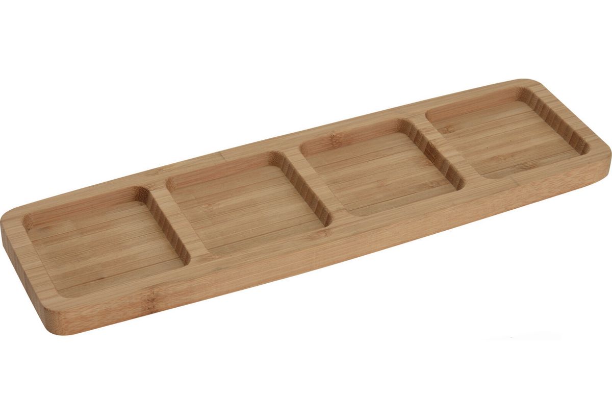 Ξεχωριστή πιατέλα με 4 θέσεις, ιδανική για σερβίρισμα διαφορετικών μεζέδων, ξηρών καρπών ή σνακ με πρακτικότητα και στυλ. Κατασκευασμένη από ανθεκτικό ξύλο μπαμπού, προσφέρει φυσική αισθητική και αντοχή στη χρήση. Ο minimal σχεδιασμός της ταιριάζει σε κάθε τραπέζι, καθιστώντας την ιδανική για καθημερινή χρήση αλλά και για πιο επίσημες περιστάσεις.