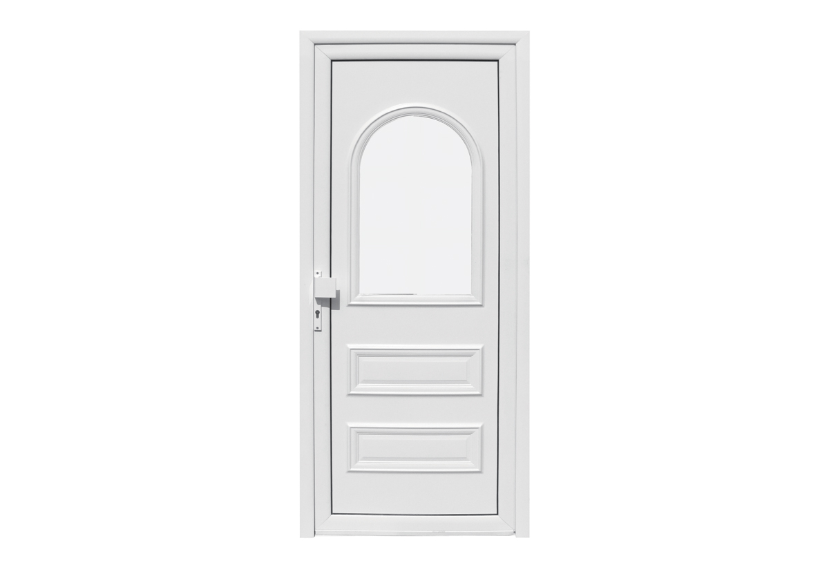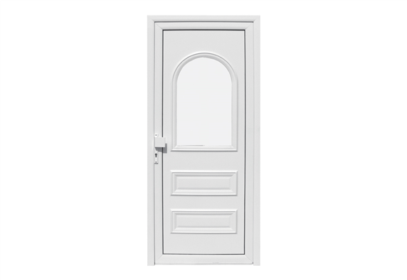Πόρτα εισόδου αλουμινίου με τζάμι, με πρεβάζι, κλειδαριά και πομολο, σε λευκή απόχρωση.