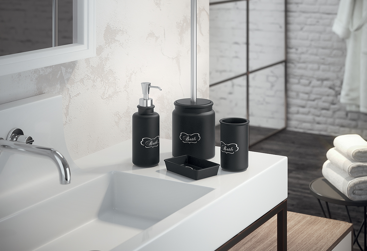 Η σαπουνοθήκη Chantal αποτυπώνει την έννοια του εκλεπτυσμένου design μέσα από τη γεωμετρία της απλότητας. Το ορθογώνιο σχήμα της εξασφαλίζει λειτουργικότητα, ενώ η ματ κεραμική επιφάνεια προσφέρει πολυτελή αίσθηση αφής και εύκολο καθάρισμα. Το μαύρο της χρώμα αποπνέει σύγχρονη κομψότητα, αναδεικνύοντας τον νιπτήρα με τρόπο διακριτικό αλλά εντυπωσιακό. Η επιγραφή “Bath” προσθέτει μια ρετρό πινελιά, ενισχύοντας την αισθητική του χώρου.
