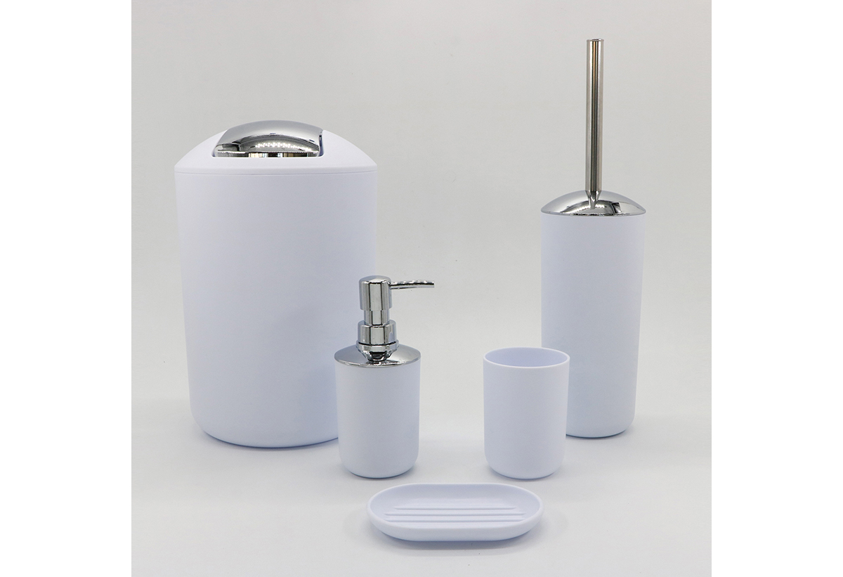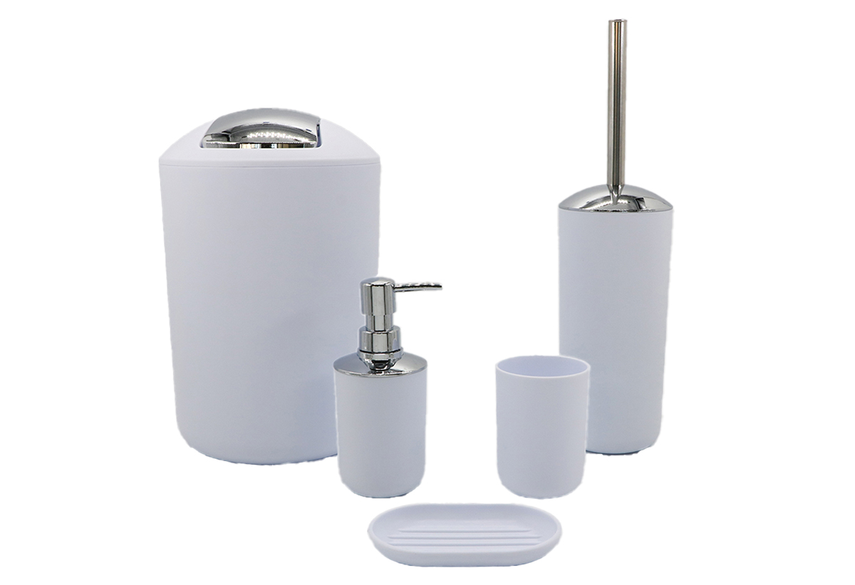 Το σετ μπάνιου 5 τεμαχίων περιλαμβάνει ένα ντισπένσερ, μία ποτηροθήκη, ένα χαρτοδοχείο, ένα πιγκάλ και μια σαπουνοθήκη. Η πλαστική του κατασκευή, αποτελεί ιδιαίτερα ανθεκτικό υλικό στο πέρας του χρόνου, αλλά και στη χρήση. Με το σχεδιασμό και το χρώμα τους, θα ταιριάξουν κατάλληλα στο μπάνιο σου και θα σε βοηθήσουν να διατηρείς οργανωμένα τα αντικείμενά σου στις αντίστοιχες θέσεις τους. Ανανέωσε τον χώρο σου και δημιούργησε ένα μίνιμαλ περιβάλλον.