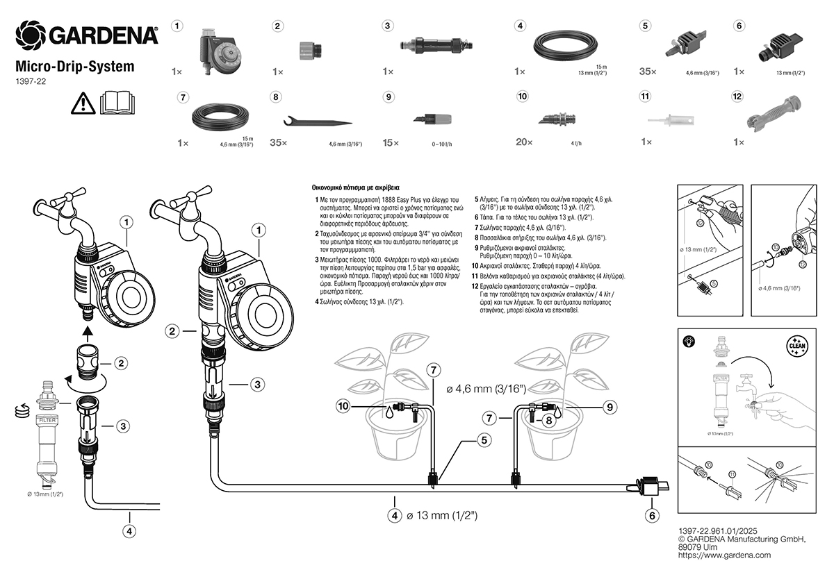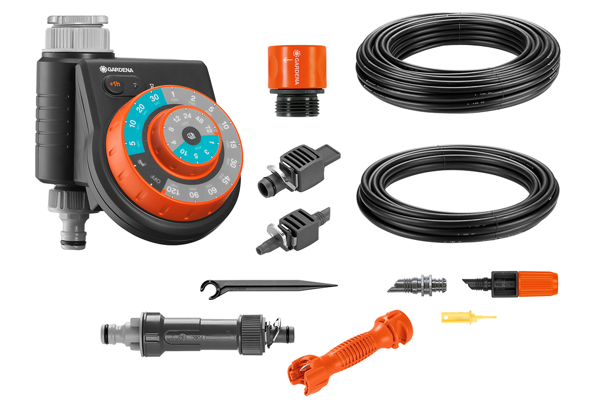 Το σετ ποτίσματος περιλαμβάνει όλα τα συστατικά που απαιτούνται για την άρδευση με εξοικονόμηση νερού των γλαστρών, των μπαλκονιών και των αιθρίων.