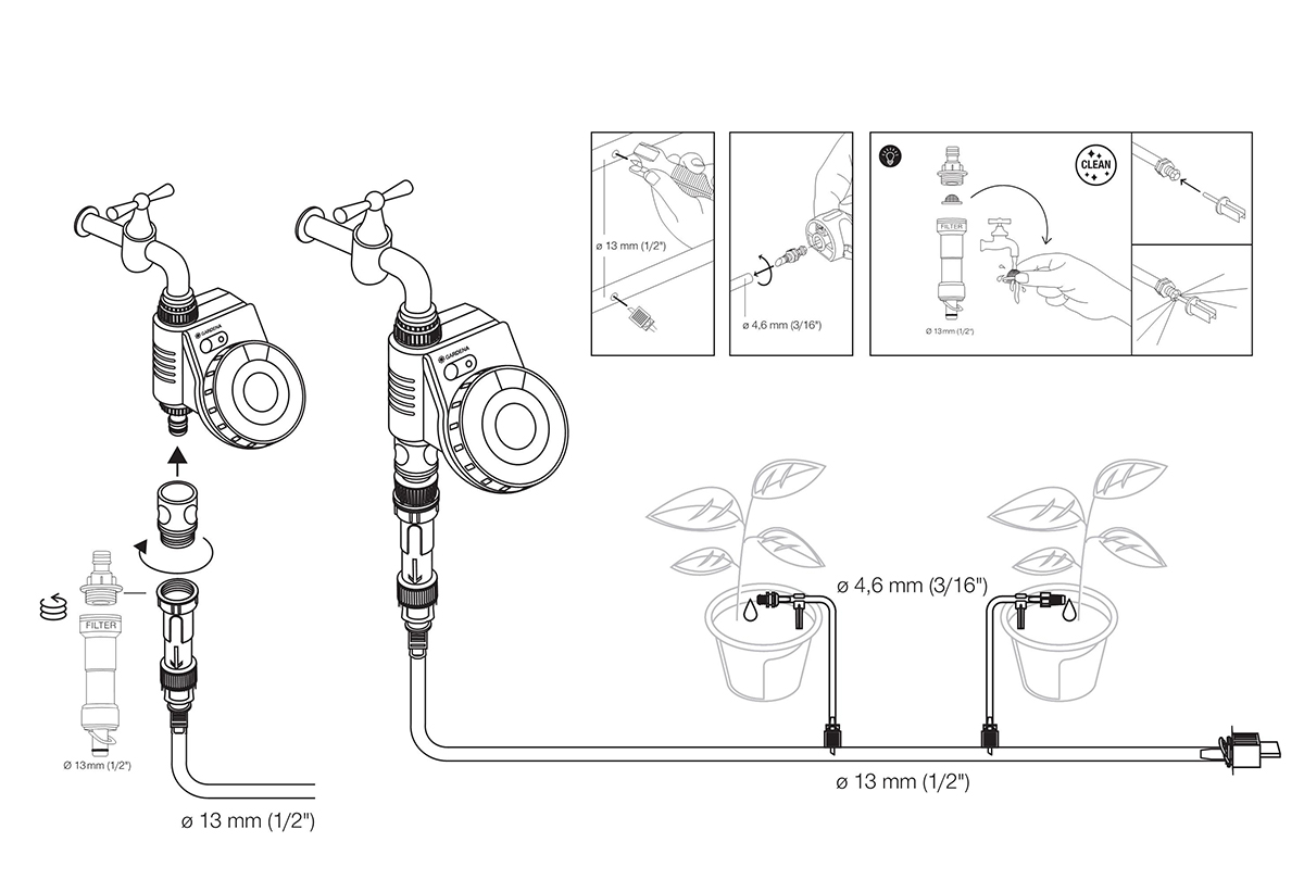 Περιλαμβάνει όλα τα απαραίτητα εξαρτήματα για αυτόματο πότισμα σε έως 35 γλάστρες, εξοικονομώντας παράλληλα νερό. Η μονάδα ρύθμισης πίεσης συνδέεται με τη βρύση μέσω του ειδικού μετατροπέα. Τα φυτά ποτίζονται μεμονωμένα, αλλά με ακρίβεια χάρη στο σύστημα σωλήνων με κεφαλές σταγόνας. Η τεχνολογία σύνδεσης επιτρέπει σε όλα τα μέρη να συνδέονται εύκολα και γρήγορα μεταξύ τους και με άρτια εφαρμογή. Ο προγραμματιστής ποτίσματος 1888 Easy plus ελέγχει αυτόματα το σύστημα.