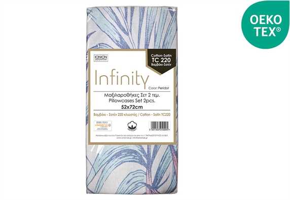 Η μαξιλαροθήκη Ionion Infinity, με 220 κλωστές και σχέδιο φύλλων, προσφέρει απαλή υφή και εξαιρετική ποιότητα. Κατασκευασμέν από 100% βαμβάκι/σατέν εξασφαλίζει άνεση και πολυτέλεια, ενώ η απόχρωση Peridot προσδίδει φρεσκάδα στον χώρο σου. Οι διαστάσεις 52x72cm και το σετ των δύο τεμαχίων συνδυάζουν ιδανικά λειτουργικότητα και στιλ.