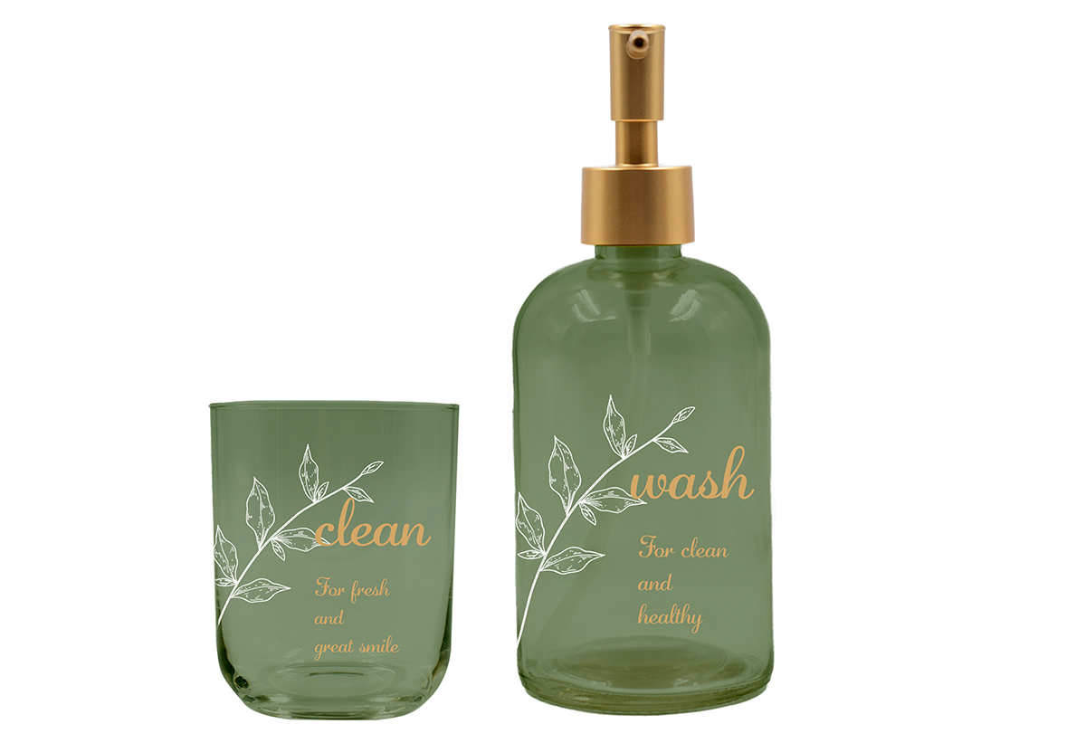 Το σετ Marva Home Viola περιλαμβάνει ντισπένσερ και ποτηροθήκη, σχεδιασμένα για να συνδυάζουν πρακτικότητα και αισθητική με έμπνευση από τη φύση. Κατασκευασμένα από γυαλί σε ανοιχτό πράσινο χρώμα, διακοσμούνται με λευκό γραμμικό σχέδιο που απεικονίζει ένα φυτό, ενώ η διακριτική χρυσή επιγραφή προσθέτει έναν εκλεπτυσμένο τόνο στο σύνολο.