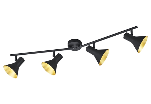 Το σποτ Nina φέρνει τον δημοφιλή vintage αέρα στο σαλόνι, την κρεβατοκάμαρα ή τον διάδρομό σου, προσθέτοντας μοναδική φινέτσα. Οι περιστρεφόμενες κεφαλές σου επιτρέπουν να κατευθύνεις το φως όπως επιθυμείς, δημιουργώντας ιδανικό φωτισμό περιβάλλοντος. Ο κομψός συνδυασμός ματ μαύρου εξωτερικά και χρυσού εσωτερικά προσφέρει ζεστό και φιλόξενο φωτισμό, ενώ οι διαστάσεις του το καθιστούν ιδανικό για διάφορους χώρους. Μια εξαιρετική επιλογή για ρετρό και μοντέρνες διακοσμήσεις.