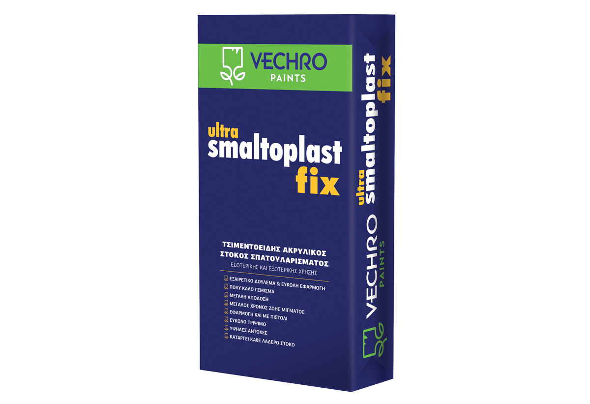 Οι επιφάνειες πρέπει να είναι απαλλαγμένες από σκόνες, ασβέστες και λάδια. Ανακατεύουμε καλά, μέχρι δημιουργίας ομογενούς πάστας. Η πάστα μπορεί να δουλευτεί για 4-6 ώρες, ανάλογα με την θερμοκρασία. Κατά διαστήματα προτείνεται ανακάτεμα της πάστας, για να μαλακώσει το υλικό χωρίς προσθήκη επιπλέον νερού. Εφαρμόζουμε δύο στρώσεις Ultra Smaltoplast Fix. Μπορεί να δεχθεί οποιοδήποτε είδος οικοδομικού χρώματος ως τελικό, αφού στεγνώσει καλά, με την κατάλληλη προετοιμασία-αστάρωμα.