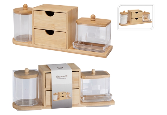 Η θήκη οργάνωσης καλλυντικών από bamboo είναι ο ιδανικός τρόπος για να διατηρείς τον χώρο σου τακτοποιημένο και κομψό. Με μήκος 29.5cm, προσφέρει πρακτική αποθήκευση για βαμβάκια, δίσκους ντεμακιγιάζ, πινέλα και μικρά καλλυντικά, ώστε να τα έχεις πάντα οργανωμένα και εύκολα προσβάσιμα. Ο συνδυασμός φυσικού bamboo και διάφανου ακρυλικού χαρίζει μια minimal και eco αισθητική, που ταιριάζει άψογα τόσο στο μπάνιο όσο και στο boudoir σου. Οι δύο συρταριέρες και τα διάφανα δοχεία με καπάκι προσθέτουν λειτουργικότητα και στιλ.