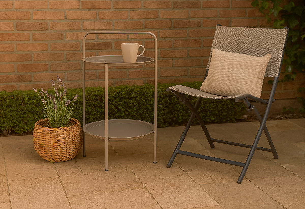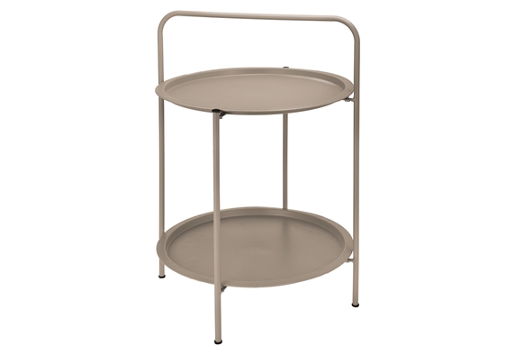 Το στρογγυλό τραπέζι κήπου με μεταλλικό σκελετό σε διακριτική απόχρωση taupe προσφέρει μοντέρνο και πρακτικό σχεδιασμό για τον εξωτερικό χώρο. Με τις δύο επιφάνειες αποθήκευσης, αποτελεί ιδανική επιλογή για μικρές συνθέσεις, σερβίρισμα ποτών ή διακοσμητικά αντικείμενα. Οι διαστάσεις του (50x66cm) το καθιστούν ευέλικτο για χρήση σε μπαλκόνι, βεράντα ή κήπο.
