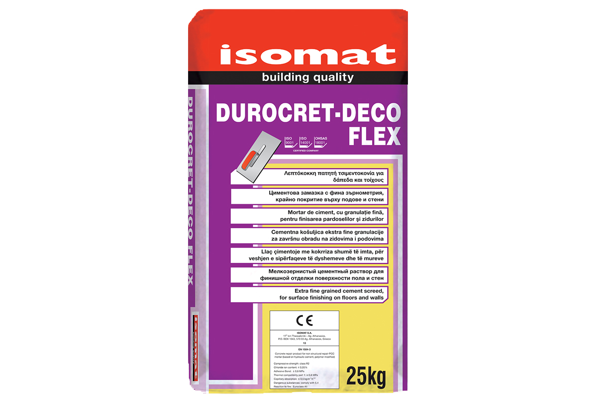 Το Durocret-Deco Flex είναι ένα προπαρασκευασμένο, εύκαμπτο, ρητινούχο, ινοπλισμένο τσιμεντοκονίαμα, χωρίς διαβρωτικά συστατικά, για εξωτερική ή εσωτερική χρήση σε δάπεδα και τοίχους. Παρέχει: