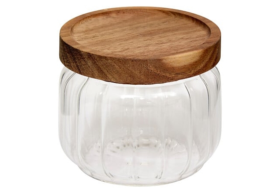 Βάζο αποθήκευσης Marva Home Harmony 300ml από διάφανο, ραβδωτό γυαλί με κομψό ξύλινο καπάκι, ιδανικό για μπαχαρικά, ζάχαρη, ξηρούς καρπούς ή μικροαντικείμενα. Οργανώνει τον πάγκο και χαρίζει ζεστή, φυσική αισθητική που ταιριάζει σε μοντέρνα και σκανδιναβικά στιλ. Το γυάλινο σώμα αναδεικνύει το περιεχόμενο, ενώ το καπάκι εφαρμόζει σταθερά για καθημερινή χρήση. Για τη φροντίδα του, πλένεις το γυάλινο μέρος στο χέρι και στεγνώνεις καλά, ενώ το ξύλινο καπάκι το καθαρίζεις με ελαφρώς νωπό πανί.