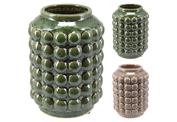 Αυτό το κεραμικό βάζο σε ποικιλία αποχρώσεων ξεχωρίζει χάρη στην τρισδιάστατη υφή του, που δημιουργείται από στρογγυλές ανάγλυφες λεπτομέρειες στην επιφάνειά του. Η στιλπνή υάλωση χαρίζει λάμψη και βάθος στο χρώμα, προσθέτοντας έναν κομψό και ταυτόχρονα παιχνιδιάρικο χαρακτήρα. Μπορεί να χρησιμοποιηθεί είτε ως διακοσμητικό αντικείμενο μόνο του, είτε για να αναδείξει λουλούδια, αποξηραμένα κλαδιά ή ακόμη και ως μοναδικό κεντρικό διακοσμητικό σε τραπεζαρία ή μπουφέ. Ταιριάζει σε χώρους όπως το σαλόνι, το χωλ, ένα ράφι βιβλιοθήκης ή ακόμη και σε επαγγελματικά περιβάλλοντα που αναζητούν αισθητική ζεστασιά. Χάρη στον σχεδιασμό του, δένει αρμονικά με rustic, boho, μοντέρνα αλλά και scandi διακόσμηση.