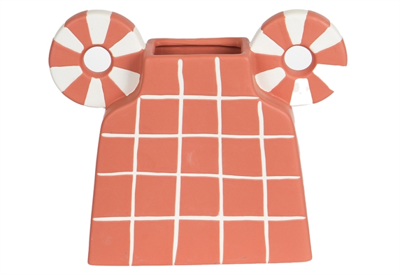 Το κεραμικό βάζο Sunset, διαστάσεων 30.6x8x22.5cm, συνδυάζει το σομόν με το λευκό σε ένα μοτίβο καρό που θυμίζει ήρεμα καλοκαιρινά απογεύματα. Οι κυκλικές του λαβές, με ακτινωτό σχέδιο, προσδίδουν μία μοντέρνα και παιχνιδιάρικη νότα, που κάνει το βάζο να ξεχωρίζει.