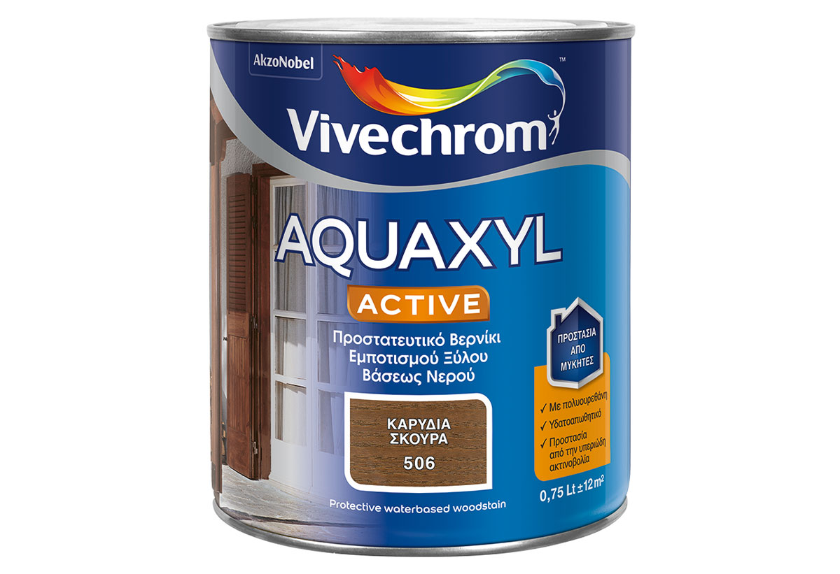 Το AQUAXYL ACTIVE είναι υδατοδιαλυτό προστατευτικό βερνίκι εμποτισμού ξύλου χαμηλής οσμής, εσωτερικής και εξωτερικής χρήσης, ενισχυμένο με πολυουρεθάνη. Αναδεικνύει τη φυσική ομορφιά του ξύλου και ταυτόχρονα το προστατεύει, αποτρέποντας την ανάπτυξη μούχλας και μυκήτων στο φιλμ του βερνικιού. Εμποτίζει το ξύλο, σχηματίζοντας ένα λεπτό υδατοαπωθητικό, ελαστικό υμένα που ακολουθεί τις συστολές και διαστολές του ξύλου επιτρέποντας τη διαπνοή του. Είναι ιδανικό για κάθε καινούργια ή άβαφη ξύλινη επιφάνεια όπως πόρτες, παράθυρα, κουφώματα, ταβάνια, ξυλεπενδύσεις, υπόστεγα, πέργκολες, περιφραξεις. Προσφέρει προστασία από την ηλιακή ακτινοβολία και δεν ξεφλουδίζει ή σπάει.
