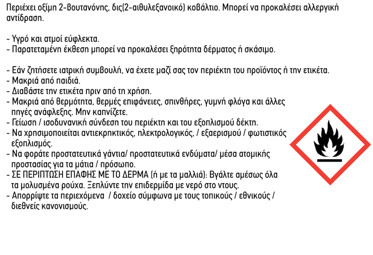 Το βερνίκι είναι στεγνό στην αφή μετά από 2-3 ώρες. Ανάλογα με τις συνθήκες εφαρμογής, ο χρόνος μπορεί να διαφέρει.