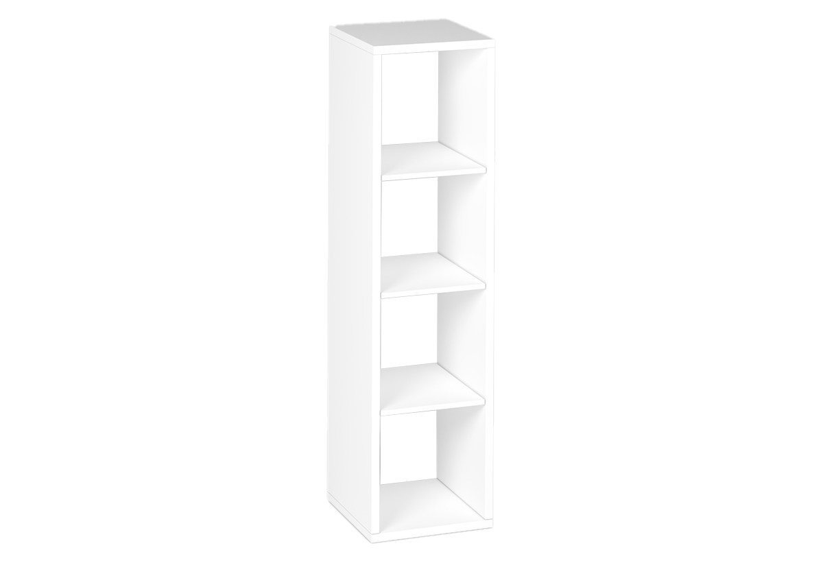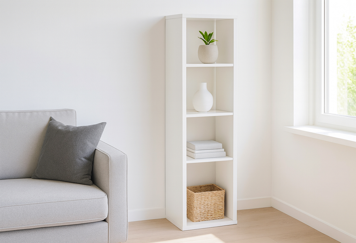 Κατασκευασμένη από μοριοσανίδα με επικάλυψη μελαμίνης, προσφέρει ανθεκτικότητα και ευκολία στη συντήρηση. Η κατηγορία εκπομπών φορμαλδεΰδης E1 εγγυάται ασφάλεια στη χρήση, ενώ οι εξωτερικές διαστάσεις Μ39xΠ40xY144cm και τα 4 ευρύχωρα τετράγωνα ράφια προσφέρουν τη δυνατότητα οργάνωσης βιβλίων, κουτιών και διακοσμητικών αντικειμένων.