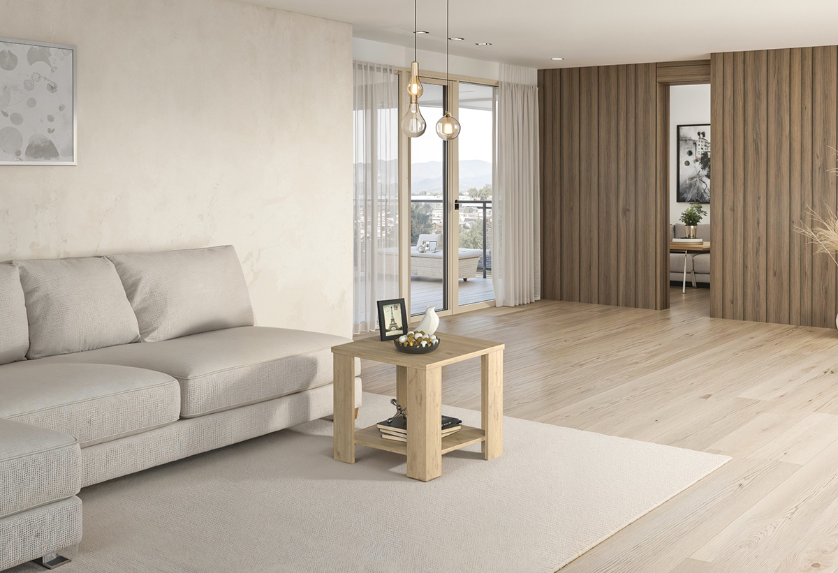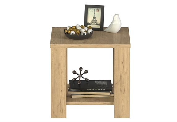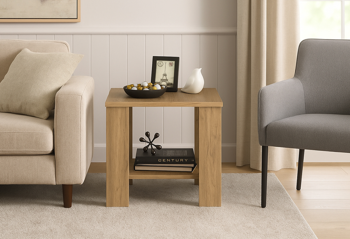 Η σταθερή επιφάνειά του είναι ιδανική για να ακουμπήσεις έναν καφέ, ένα φωτιστικό ή ένα αγαπημένο διακοσμητικό, ενώ το χαμηλότερο ράφι του σου προσφέρει αποθηκευτικό χώρο για βιβλία ή περιοδικά. Κατασκευασμένο από μοριοσανίδα με επίστρωση φυσικού χρώματος, αντέχει στη χρήση και υποστηρίζει έναν οργανωμένο, εύχρηστο χώρο.