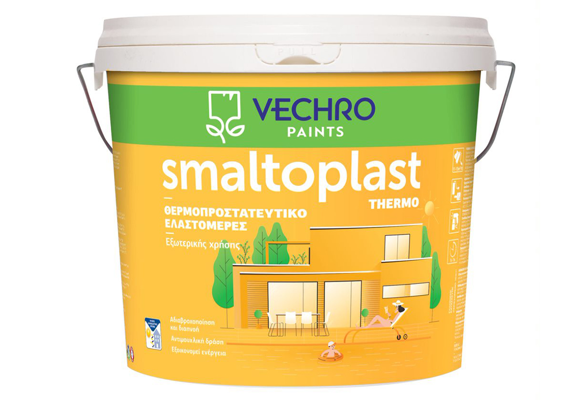 Κορυφαίας ποιότητας θερμοπραστατευτικό, θερμοανακλαστικό, αδιάβροχο ελαστομερές 100% ακρυλικό χρώμα εξωτερικής χρήσης για τη βαφή ή επαναβαφή τοίχων, σοβάδων και μπετόν. Κατάλληλο για τη βαφή επιφανειών σε περιοχές με δυσμενείς καιρικές συνθήκες και επιφανειών με προβλήματα τριχοειδών ρηγματώσεων. Διατηρεί την ελαστικότητά του σε χαμηλές θερμοκρασίες μέχρι -20ºC, χωρίς να ξεφλουδίζει σε συνθήκες παγετού.Επιτρέπει στην τοιχοποιία να αναπνέει και έτσι συσσωρεύει λιγότερη υγρασία εσωτερικά, βοηθώντας στην καλύτερη ενεργειακή της απόδοση. Λόγω της σύνθεσής του προστατεύει τον υμένα του χρώματος από την ανάπτυξη μούχλας και μυκήτων ιδιαίτερα σε επιφάνειες με πρόβλημα υγρασίας. Το Smaltoplast THERMO συνδυάζει υψηλή λευκότητα, καλυπτικότητα και απόδοση. Απλώνει θαυμάσια και δουλεύεται πολύ εύκολα. Παρουσιάζει υψηλή πρόσφυση και αντοχές στα αλκάλια και στην υγρασία και πολύ καλή αντοχή στην υπεριώδη ακτινοβολία και τις καιρικές συνθήκες. Συμβάλει στην εξοικονόμηση ενέργειας, θερμοανακλώντας την ηλιακή ακτινοβολία σε όλο το φάσμα της (SRI=114)
