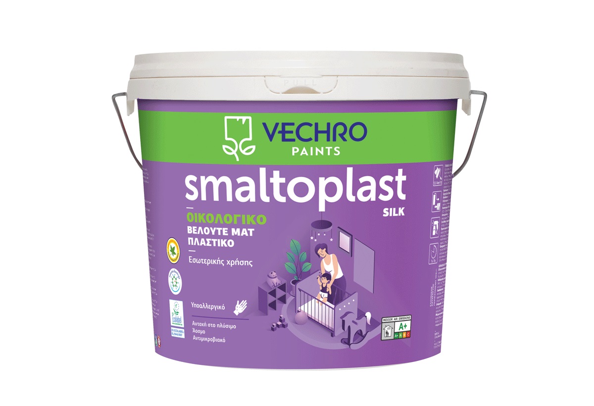 To Smaltoplast Silk είναι πιστοποιημένο οικολογικό πλαστικό χρώμα, άοσμο, εσωτερικής χρήσης με βελουτέ ματ φινίρισμα κατάλληλο για τοίχους, ταβάνια, γυψοσανίδες, σοβάδες, γυψοσοβάδες κλπ. Διαθέτει πολύ ισχυρή αντίσταση στην απορροφητικότητα λεκέδων. Λερώνεται δύσκολα και καθαρίζει πολύ εύκολα εξασφαλίζοντας πιο καθαρές επιφάνειες. Λόγω της σύνθεσής του διαθέτει αντιμικροβιακή ιδιότητα που δεν επιτρέπει την ανάπτυξη μικροοργανισμών (βακτηρίων και μυκήτων) στον υμένα του χρώματος, προσφέροντας περισσότερο ασηπτικές επιφάνειες. Ιδανικό για χώρους με υψηλά επίπεδα υγρασίας (κατοικίες χωρίς καλή μόνωση, μπάνια, κουζίνες κλπ). Ελαχιστοποιημένη περιεκτικότητα σε επικίνδυνες ουσίες. Μειωμένη περιεκτικότητα σε πτητικές οργανικές ενώσεις (ΠΟΕ).